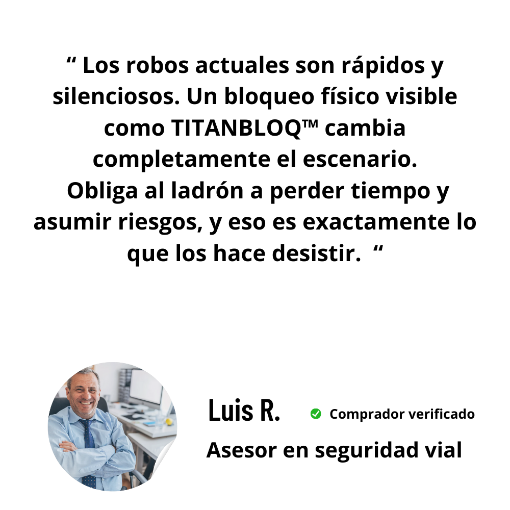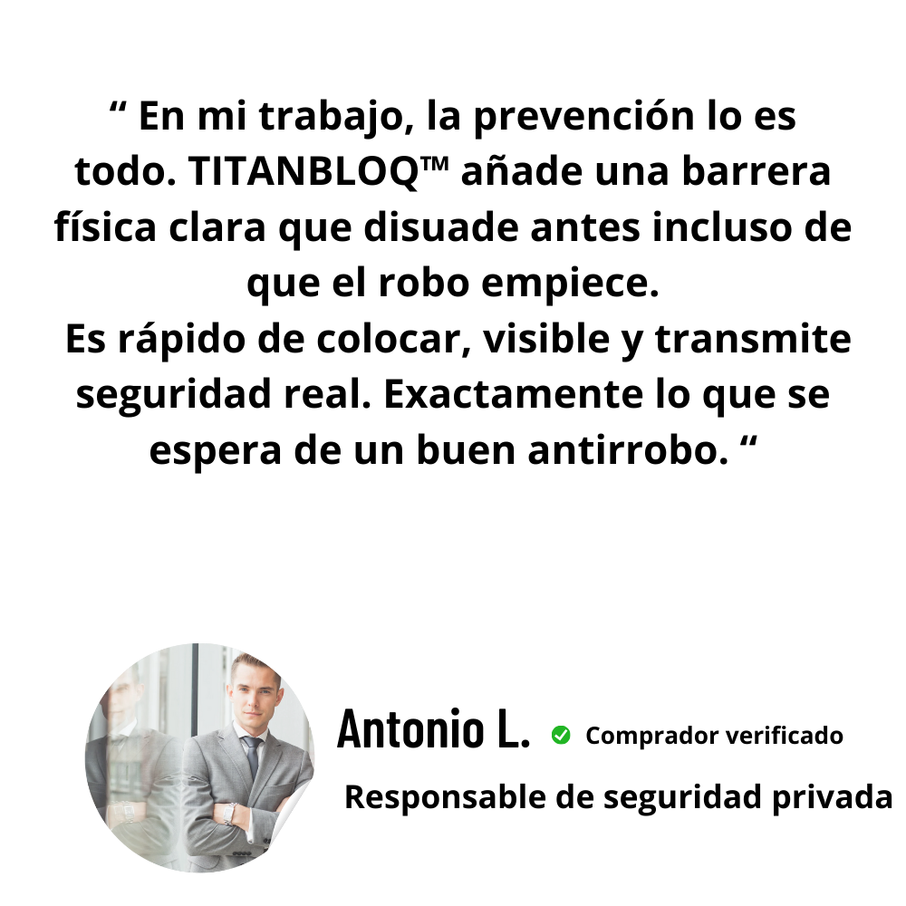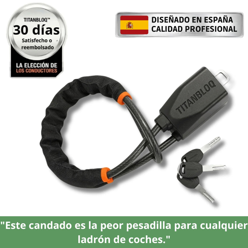 TITANBLOQ™ es la pesadilla de los ladrones. fabricado en acero trenzado reforzado de 5 mm con un candado anti-taladro de clase b, resiste cizallas, sierras, taladros y palancas. una vez instalado, retirarlo sin la llave es prácticamente imposible.